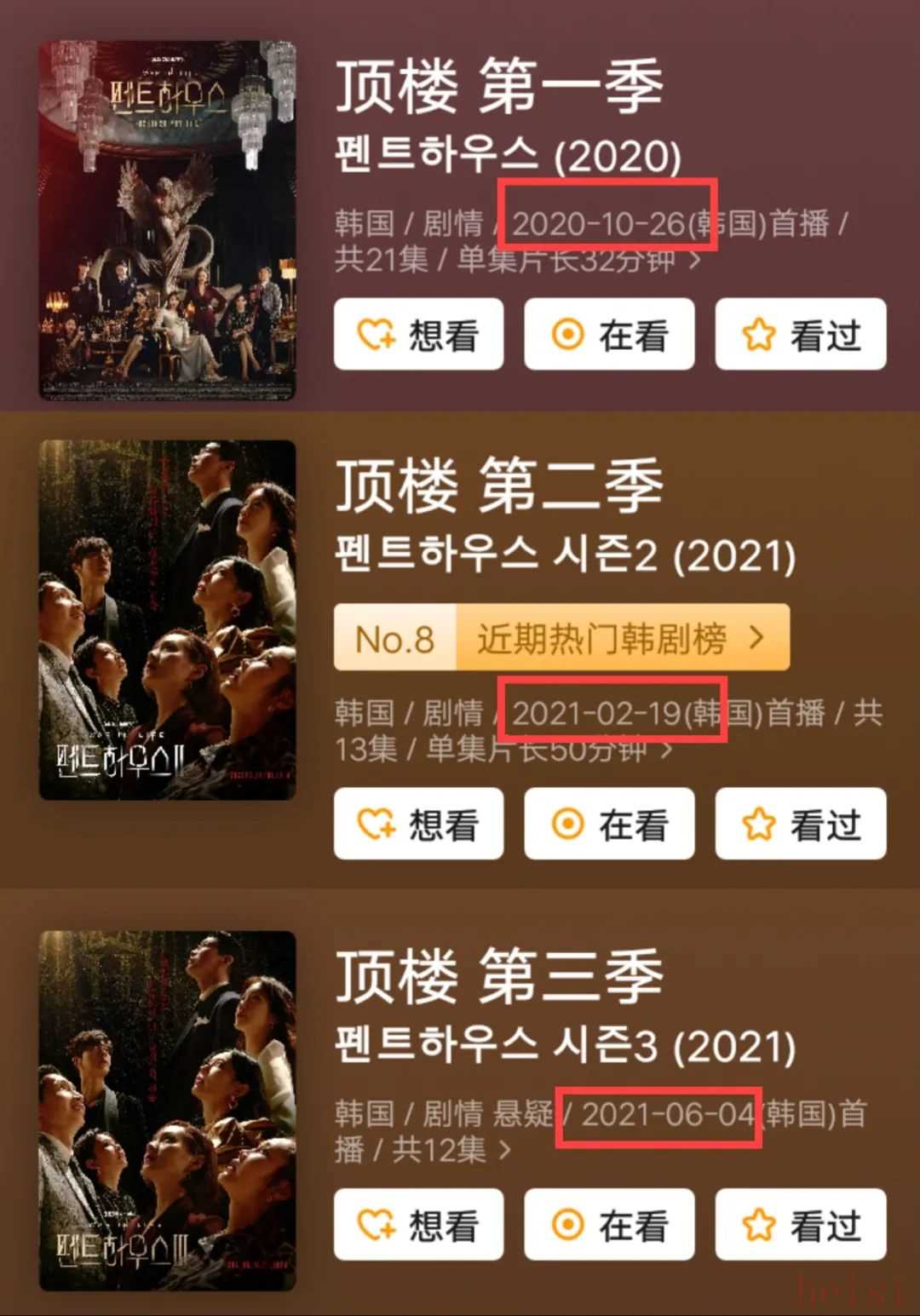 除了編劇給《頂樓》帶來的高關(guān)注度之外,《頂樓》三季的持續(xù)火熱跟它的播發(fā)方式也密切相關(guān)。2020年10月26日第一季開播之后,第二季和第三季也隨即定檔,整三季以四個月為周期接連上映。