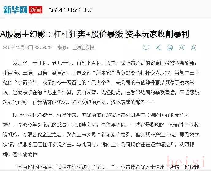 2016年11月22日,上海證券報發(fā)表重磅文章《A股易主幻影:杠桿狂奔+股價暴漲 資本玩家收割暴利》,文中質(zhì)疑:“從幾億、十幾億、到幾十億,再到上百億,入主一家上市公司的資金門檻被不斷刷新;由兩倍、三倍、四倍,到更高,上市公司“新東家”背負(fù)的資金杠桿令人膽寒;當(dāng)初二三十億的“小而美”,成了如今一兩百億的“黑大個”,殼公司的市值躥升更是顛覆了資本常識。這就是現(xiàn)在的“易主”江湖,云山霧罩、光怪陸離,在看似熱鬧的暴漲幕后,不乏朦朧利好的虛影、自我循環(huán)的泡沫、杠桿交織的羅網(wǎng)、資本玩家的鐮刀……”