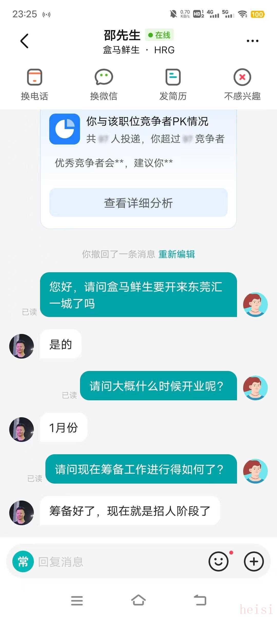 南都記者還注意到,在BOSS直聘APP上,已經(jīng)能夠查看到位于東莞海德·匯一城一區(qū)B1層的盒馬鮮生店鋪位置信息,盒馬也就此發(fā)布了崗位招聘需求。為進(jìn)一步了解情況,南都記者以求職者的身份向招聘人員咨詢(xún),得知東莞盒馬目前處于籌備及招人階段,并預(yù)計(jì)將于明年1月份開(kāi)業(yè)。