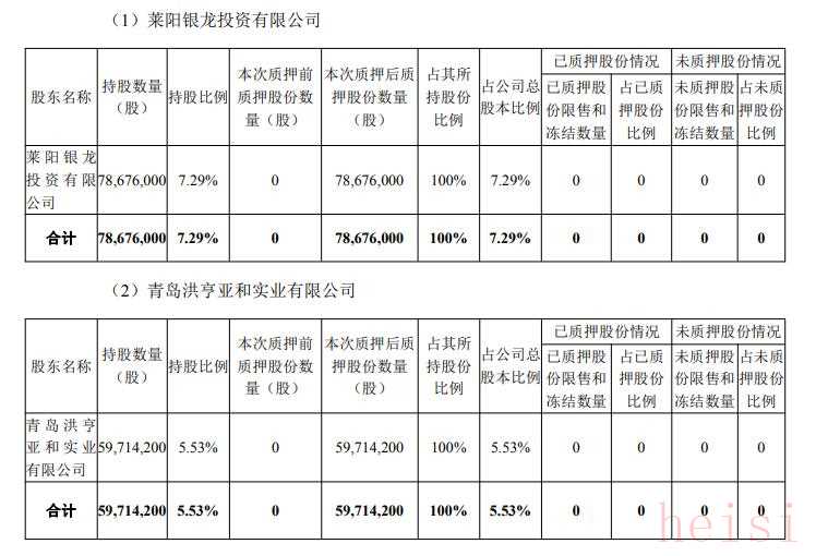 值得注意的是,龍大美食的另兩位股東萊陽銀龍投資有限公司、青島洪亨亞和實(shí)業(yè)有限公司,分別持股7.29%、5.53%,位列第二大股東、第三大股東,但這2家企業(yè)持有的龍大美食股份目前也都處于質(zhì)押狀態(tài)。