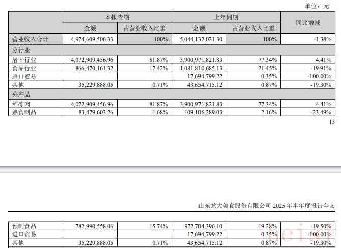 今年上半年,龍大美食的預(yù)制食品業(yè)務(wù)營(yíng)收為7.83億元,占到總營(yíng)收的15.74%,同比下降近2成。上半年,龍大美食的凈利潤(rùn)也下降了約4成。