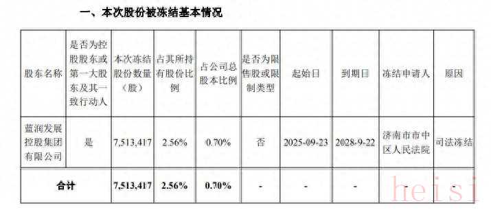 公告顯示,藍(lán)潤(rùn)發(fā)展此次被凍結(jié)的股份數(shù)量為751萬股,占其所持股份的2.56%,占龍大美食總股本的0.70%。股份凍結(jié)的起始日為2025年9月23日,到期日為2028年9月22日。