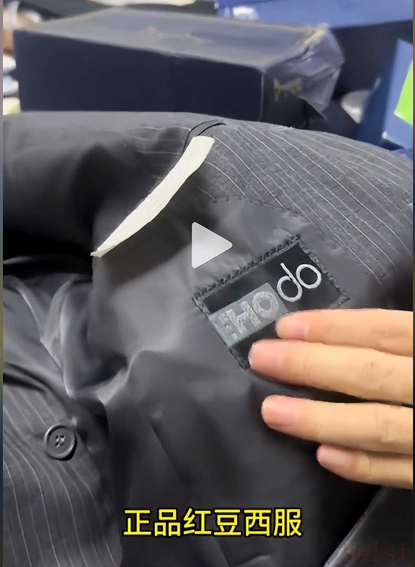 - 紅豆(紅豆杉正品):西服的商標(biāo)是線縫的,洗水嘜完整沒被剪,一目了然。