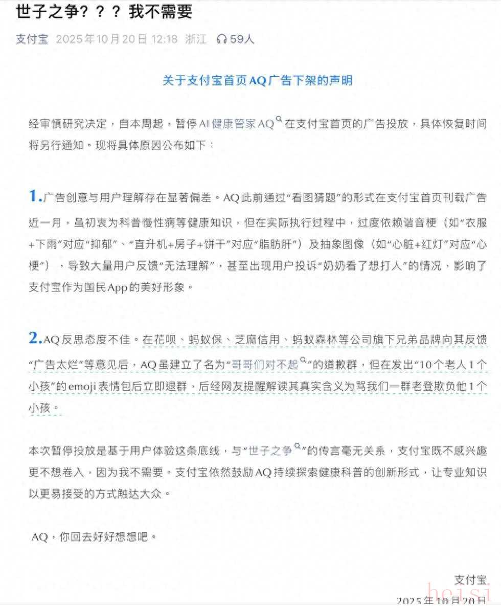 聲明稱,經(jīng)審慎研究決定,自本周起,暫停AI健康管家AQ在支付寶首頁(yè)的廣告投放,具體恢復(fù)時(shí)間將另行通知。