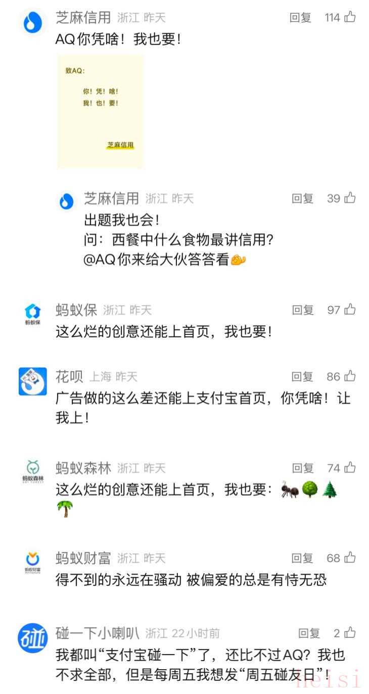 9月22日,AQ 在支付寶首頁(yè)上線了“emoji 健康猜題”活動(dòng),每周一、二更新,用表情組合的方式,讓用戶猜出一種疾病?;顒?dòng)很快獲得熱度,此后AQ希望再續(xù)支付寶首頁(yè)廣告位六個(gè)月。對(duì)此,支付寶覺得廣告創(chuàng)意欠佳;隨后,螞蟻信用、螞蟻保、花唄、螞蟻森林等其他業(yè)務(wù)線紛紛加入吐槽,用自己的官方賬號(hào)回復(fù)表示:如果AQ這種創(chuàng)意都能上首頁(yè),那自己也可以上首頁(yè)。餓了么、菜鳥、閑魚、阿里商旅等阿里系其他品牌也一起吐槽。