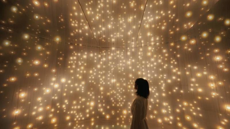《Forest of Resonating Lamps》曾在2018至2022年于臺場展出,空間中布滿了散發(fā)著暖黃燈光的玻璃燈籠,配合四周的鏡面,畫面看上去就像 天燈節(jié)一樣,打卡效果一流!