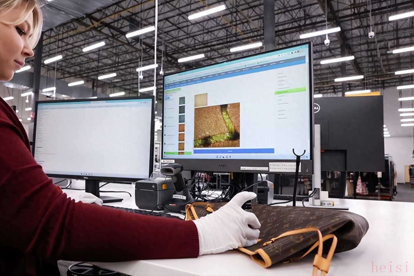 奢侈品經(jīng)銷商的員工在檢查一個路易威登包包,以驗證其真?zhèn)?/p>