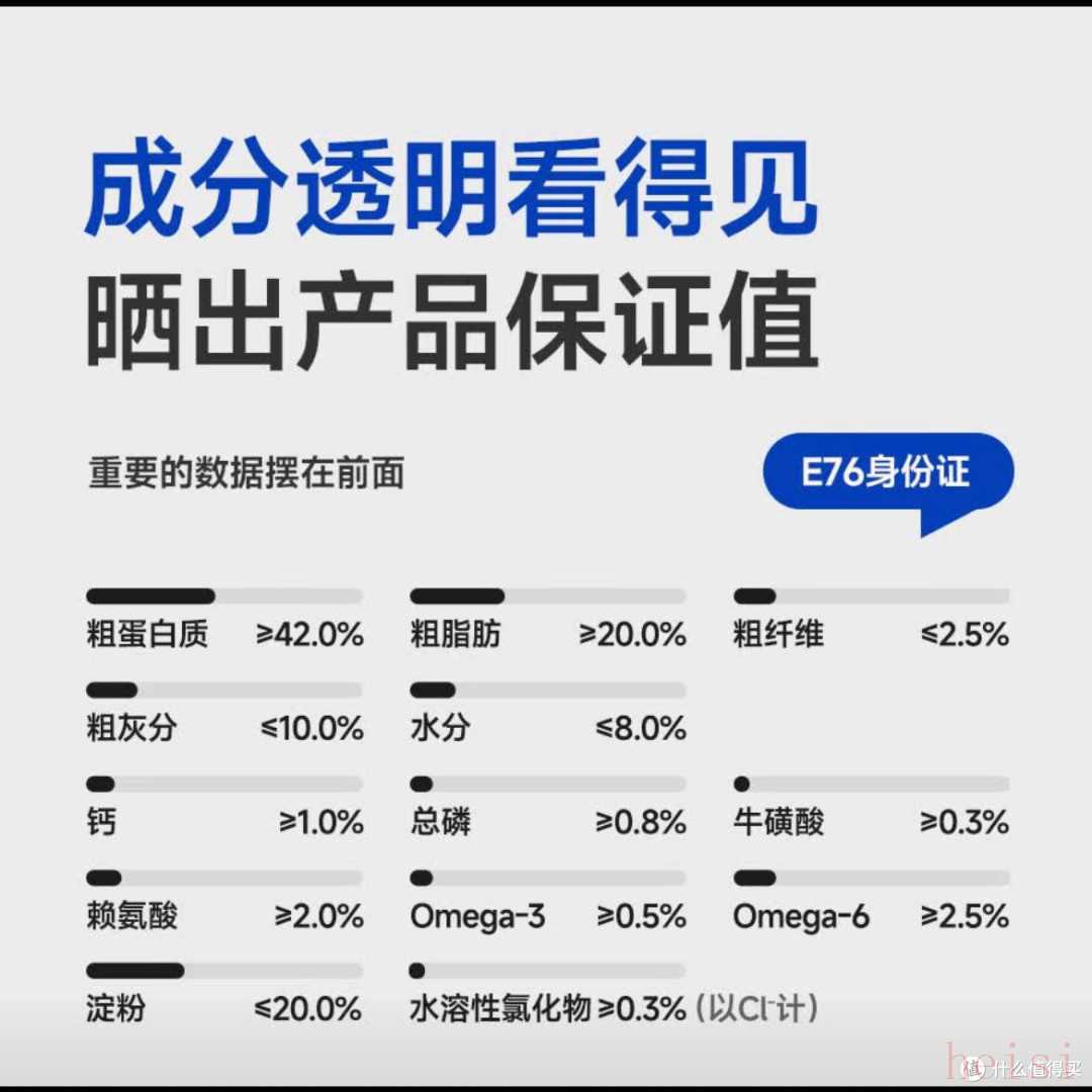 阿飛和巴弟的E76貓糧為全階段配方,主打高肉低敏,專為腸胃敏感貓咪設(shè)計(jì)。其動(dòng)物原料占比76%,動(dòng)物性原料達(dá)90%,含64.5%鮮雞肉、5.5%三文魚(yú)及1%鮮雞肝等內(nèi)臟,是優(yōu)質(zhì)蛋白質(zhì)主要來(lái)源。