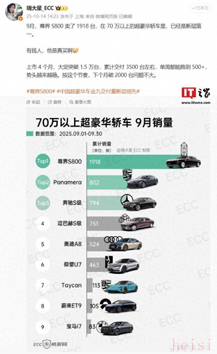 IT之家 10 月 15 日消息,汽車銷量數(shù)據(jù)追蹤和分析團(tuán)隊(duì) ECC 情報(bào)局的博主 @嗨大星_ECC 今日分享了 70 萬以上超豪華轎車 9 月銷量排行榜,其中尊界 S800 以 1918 輛的銷量數(shù)據(jù)登頂該榜、斷層領(lǐng)先,超第二名保時(shí)捷 Panamera 的銷量(802 輛)一倍有余,改寫了中國超豪華轎車市場格局。