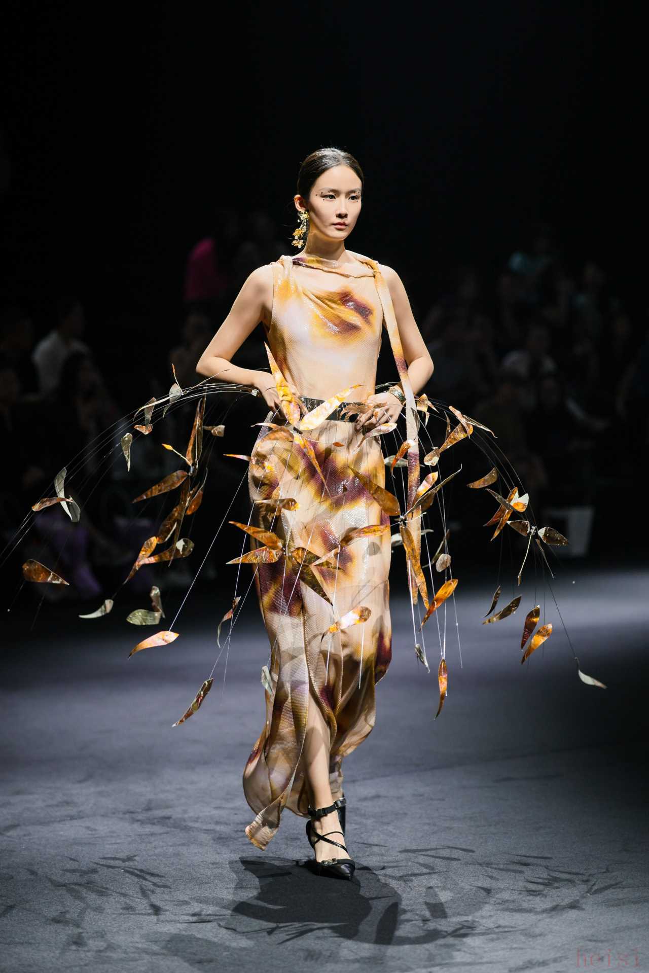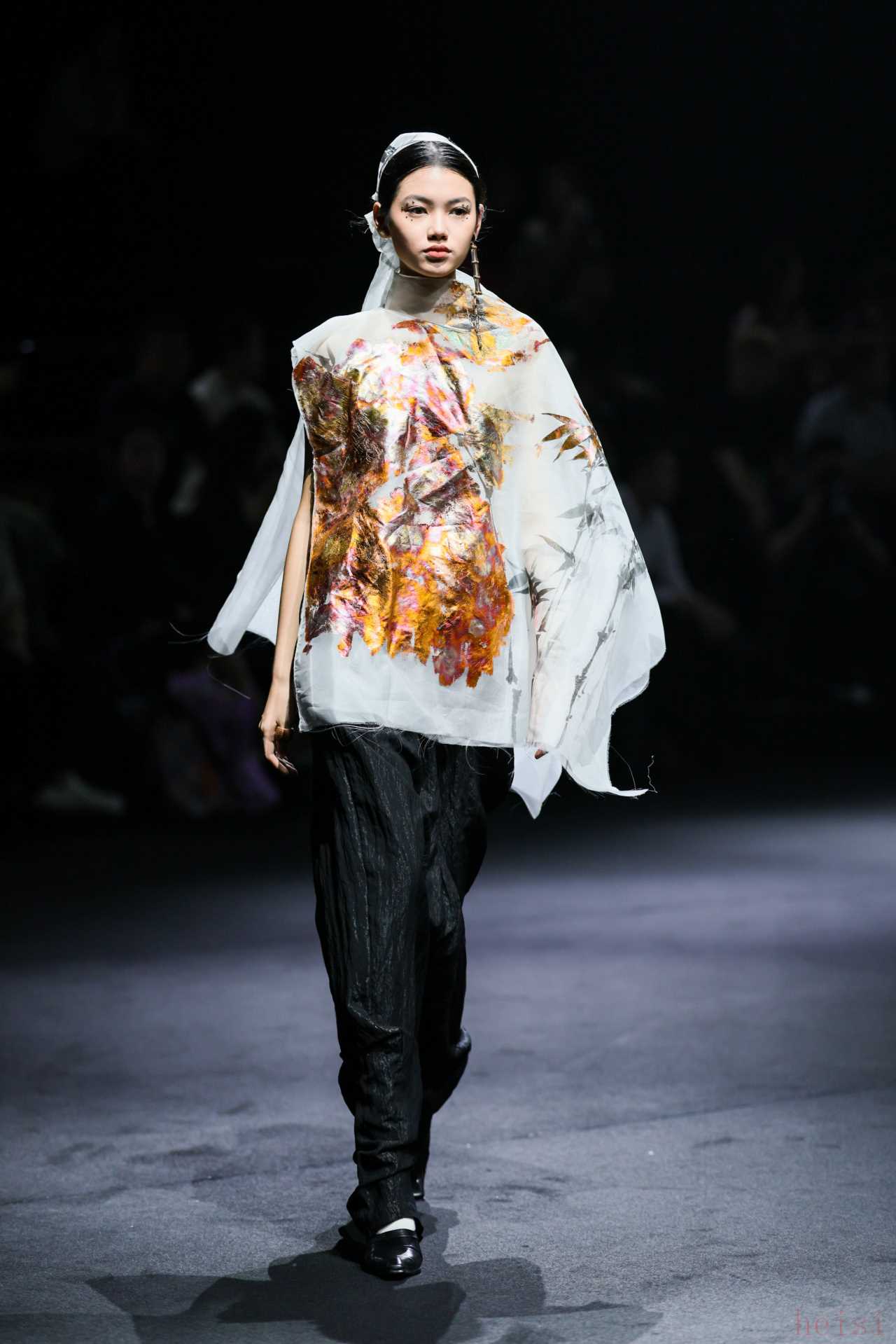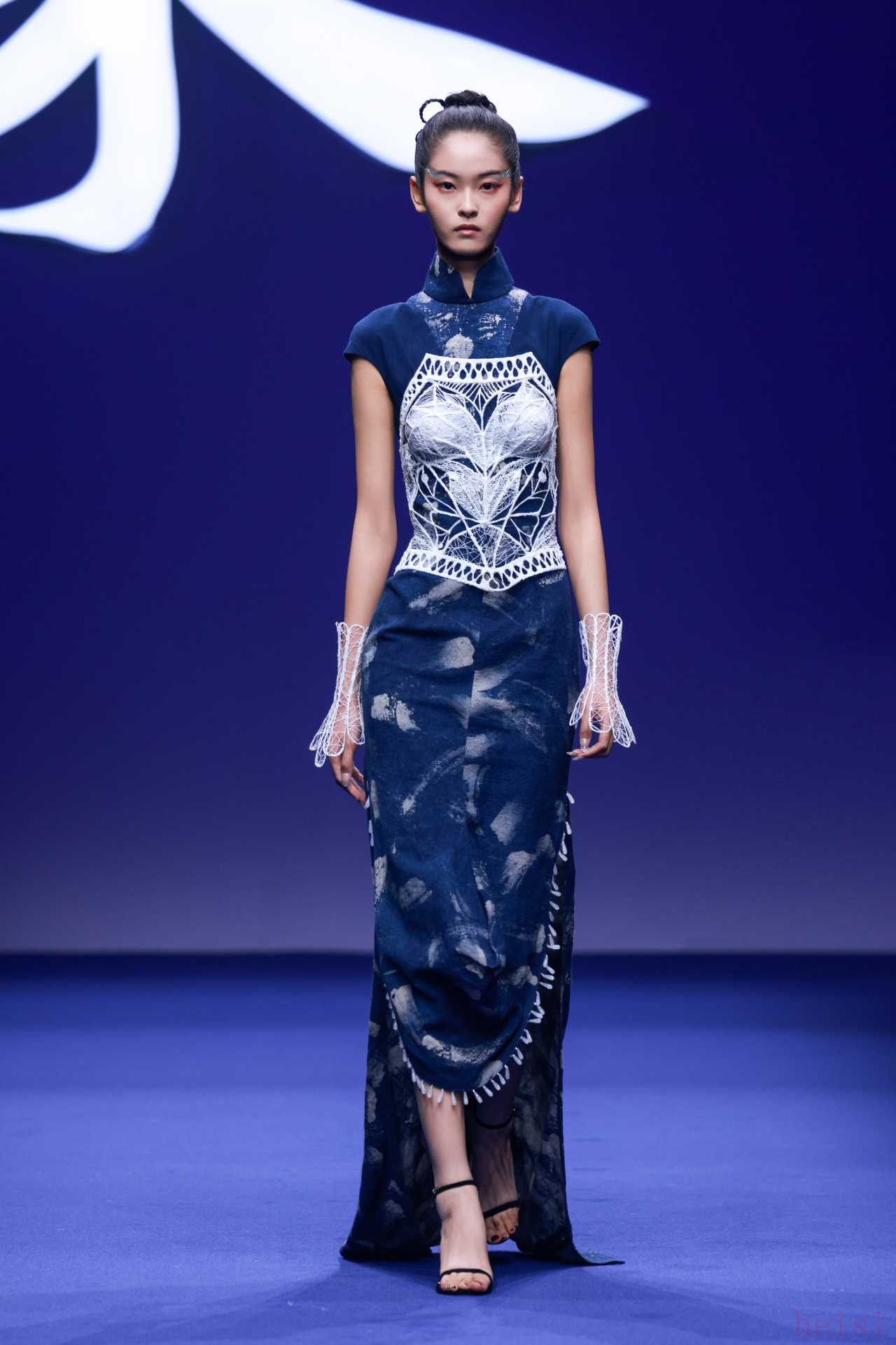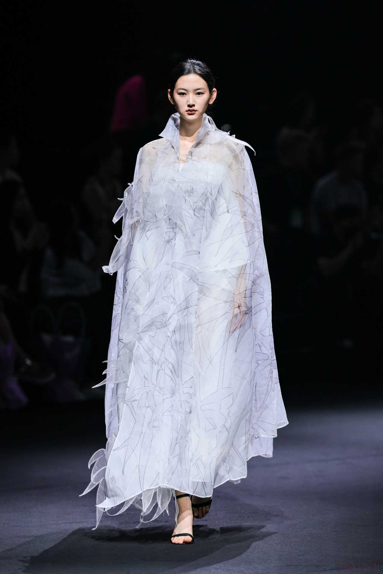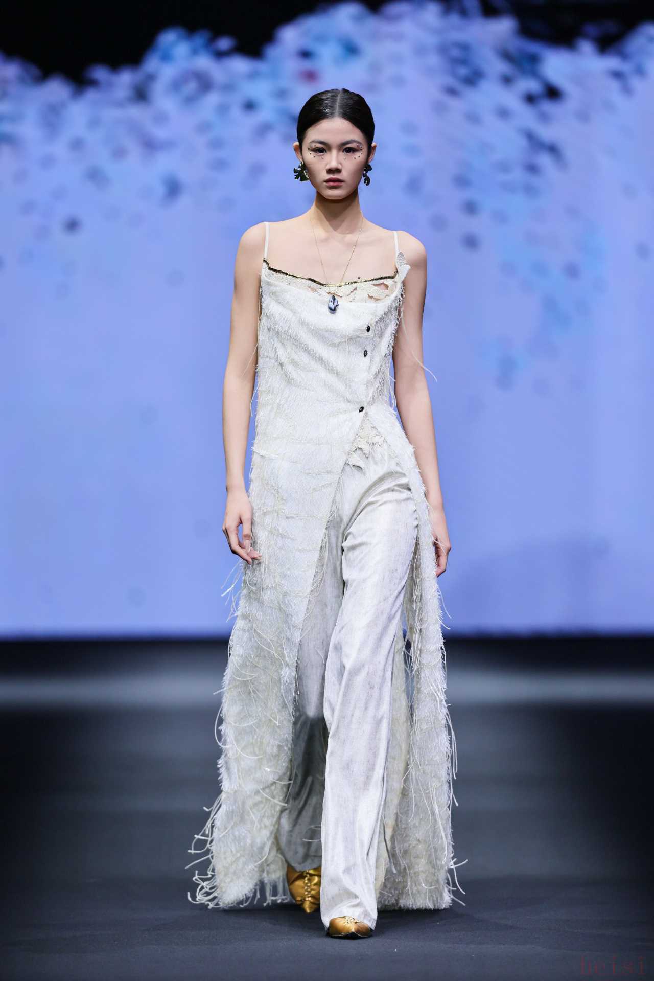 此外,Must Bloom將五谷豐登的神話故事,與非遣的剪紙文化相交識,蘊育出新的“生命”;ZIFEI WANG將云岡石窟卷云紋、夔龍紋、蓮花等經典元素抽象化輔以3D打印工藝,將傳統(tǒng)圖案轉化為抽象立體結構;北京服裝學院副院長鄒游的「紙上的叮囑」系列,將北京張家灣的大運河歷史文化融入設計;干士品牌以貴州苗族非遺蠟染結合3D打印以及編織、繩結、流蘇等手工藝呈現(xiàn)現(xiàn)代女性氣質;如子之衣融合傳統(tǒng)與現(xiàn)代服飾結構并采用天然及環(huán)保纖維傳達《詩經》意蘊;瓅錦采用“藝術+非遺織錦技藝 ”和“藝術+科技 ”來探究國潮面料時尚化的設計……豐富的創(chuàng)新設計令人應接不暇。