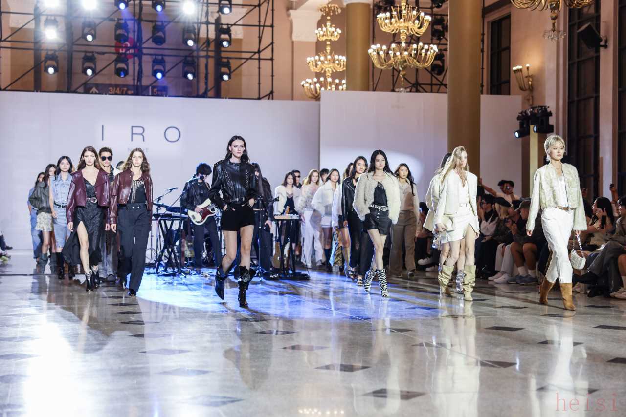 法國設計師品牌IRO night打破單一維度的時裝秀場定義,將「走秀現(xiàn)場」「音樂現(xiàn)場」「派對現(xiàn)場」「拍攝現(xiàn)場」多元合一,「Live à Paris」秀場突破T臺與觀眾區(qū)的邊界,打造真正意義上的無邊界體驗:模特與樂手并肩同行,音樂節(jié)奏與步伐共振交織,觀眾在多重感知中沉浸、共鳴、參與。