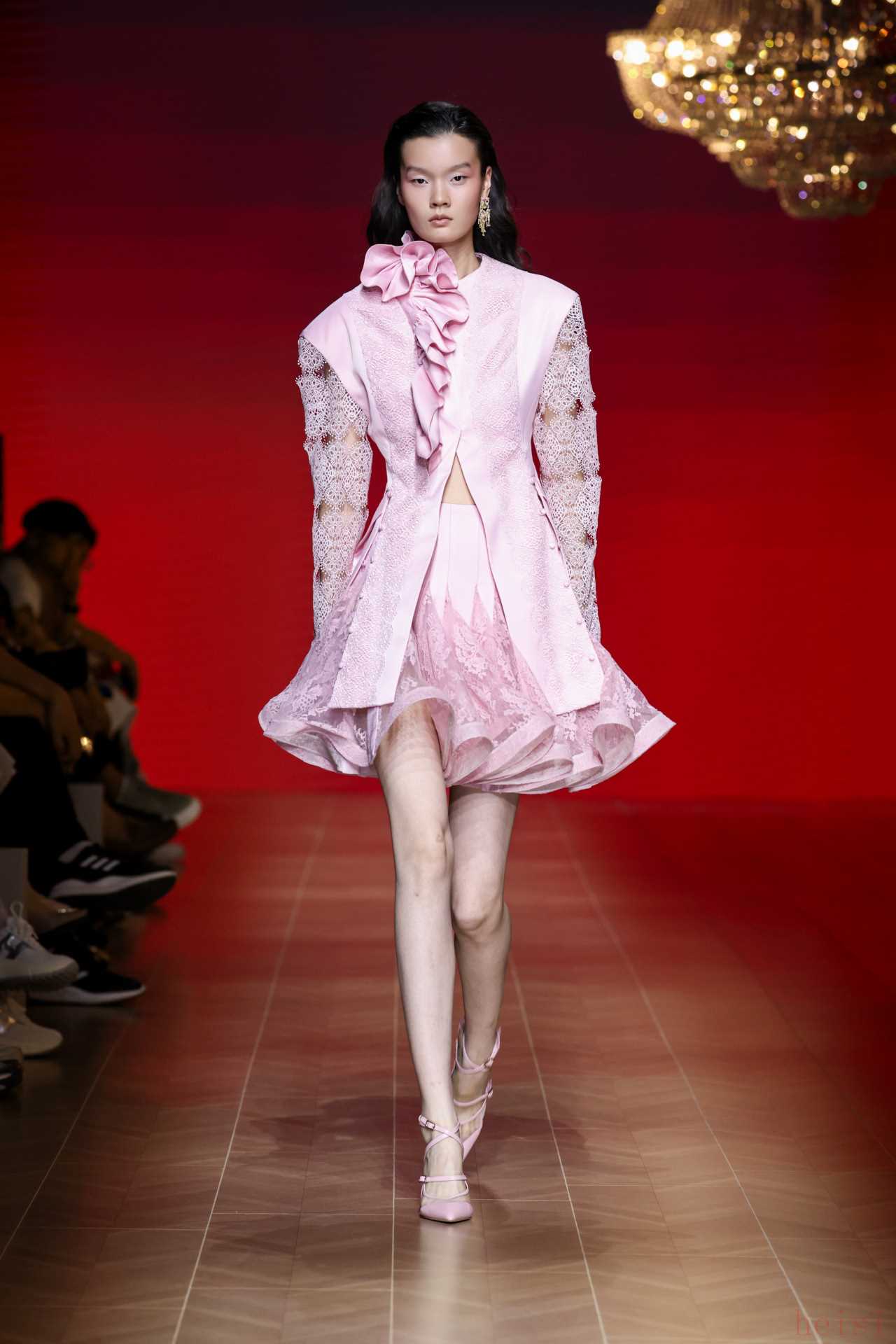 新晉“金頂獎”設計師陳龍在CHEN.1988這一季設計中以主題“理想之秋”為隱喻,代表女性內心從容、明晰、富于理想?yún)s不失嫵媚的當代氛圍,以嫩粉、漸變、跳動的波感來構建全新的色彩譜系,蕾絲、透視、鏤空、拼接、褶皺等品牌標識性立體肌理,在新一季趨于穩(wěn)定且自由。