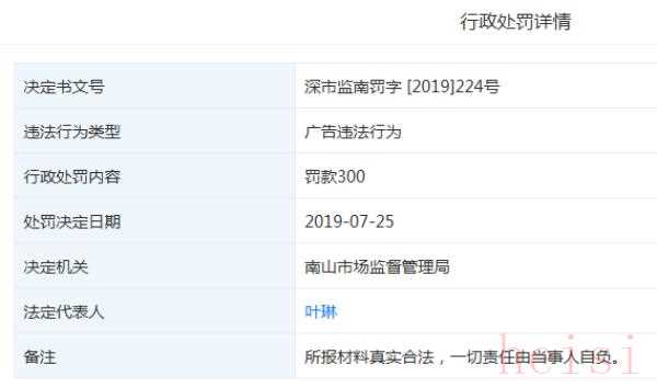 2019年7月25日,因廣告違法行為,被南山市場監(jiān)督管理局處300元罰款。