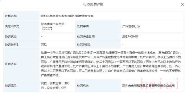 2017年9月7日,因廣告違法行為,被深圳市市場和質(zhì)量監(jiān)督管理委員會南山局處300元罰款。