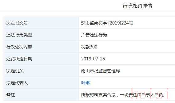 2019年7月25日,因廣告違法行為,被南山市場(chǎng)監(jiān)督管理局處300元罰款。