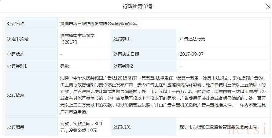 這是一個(gè)關(guān)于中國(guó)深圳市場(chǎng)監(jiān)管部門(mén)處罰瑋言服飾的消息。