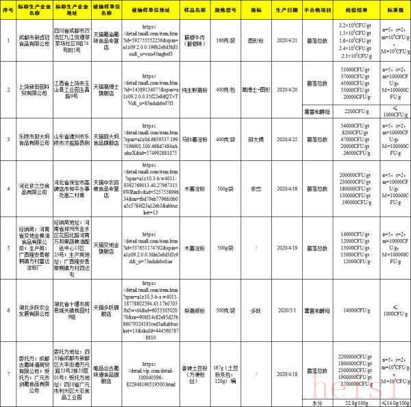 (三)天貓廚大媽食品旗艦店(經營者為北京廚大媽食品集團有限公司)在天貓(網店)銷售的、標稱山東省德州市樂陵市廚大媽食品有限公司生產的馬鈴薯淀粉,菌落總數不符合食品安全國家標準規(guī)定。