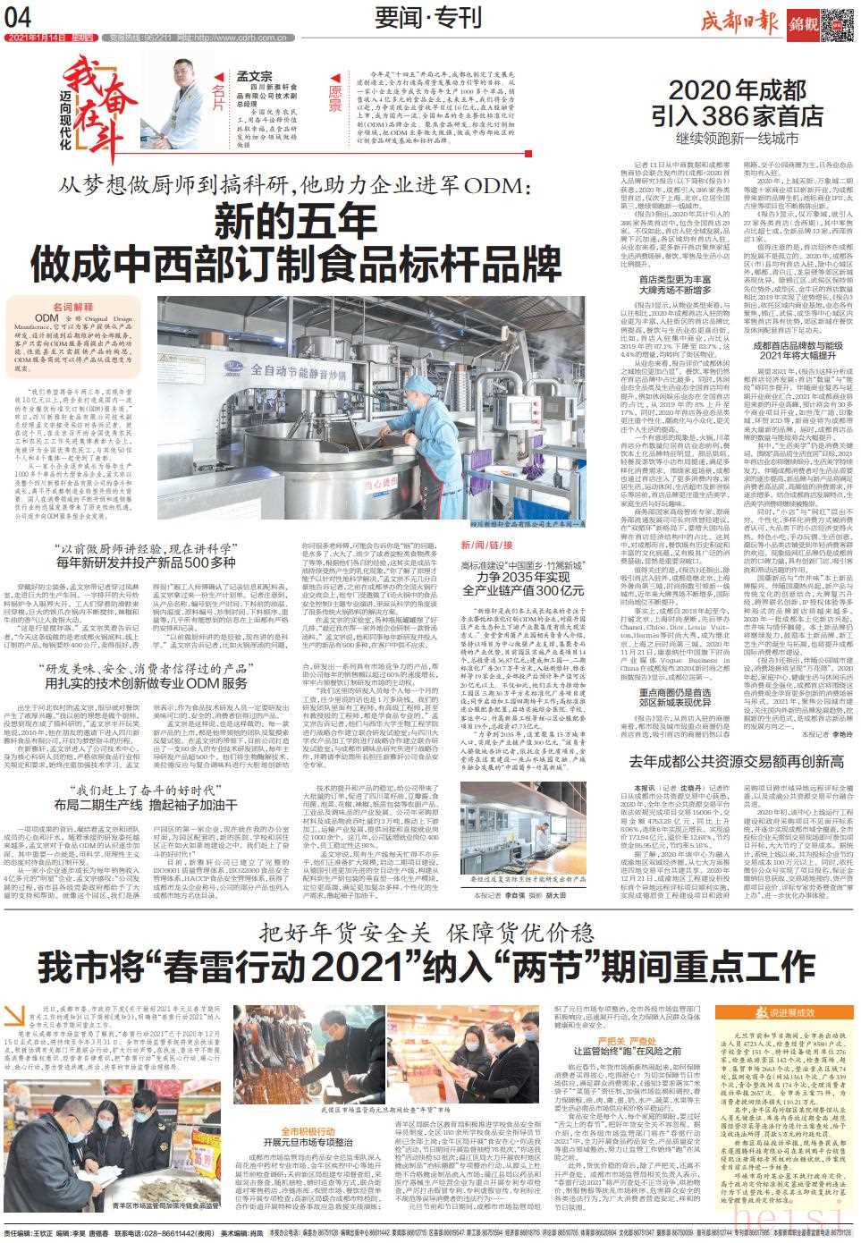 愿景今年是“十四五”開局之年,成都也制定了發(fā)展先進制造業(yè),全力打造高質量發(fā)展動力引擎的目標。從一家小企業(yè)逐步成長為每年生產1000多個單品,銷售收入4億多元的食品企業(yè),未來五年,我們將全力以赴,力爭實現(xiàn)企業(yè)營收早日過10億元,在A股融資上市,成為國內一流、全國知名的專業(yè)餐飲標準化訂制(ODM)品牌企業(yè)。聚焦食品研發(fā)、標準化訂制細分領域,把ODM業(yè)務做大做強,做成中西部地區(qū)的訂制食品研發(fā)基地和標桿品牌。