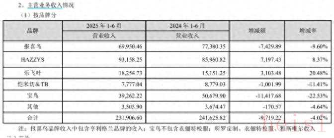 今年上半年,報(bào)喜鳥主品牌收入同比下滑9.6%至7億元,門店數(shù)量較2024年底凈減少4家至817家。東方證券在近期發(fā)布的研報(bào)中認(rèn)為,報(bào)喜鳥品牌因?yàn)橄鄬?duì)定位更商務(wù)承壓明顯。