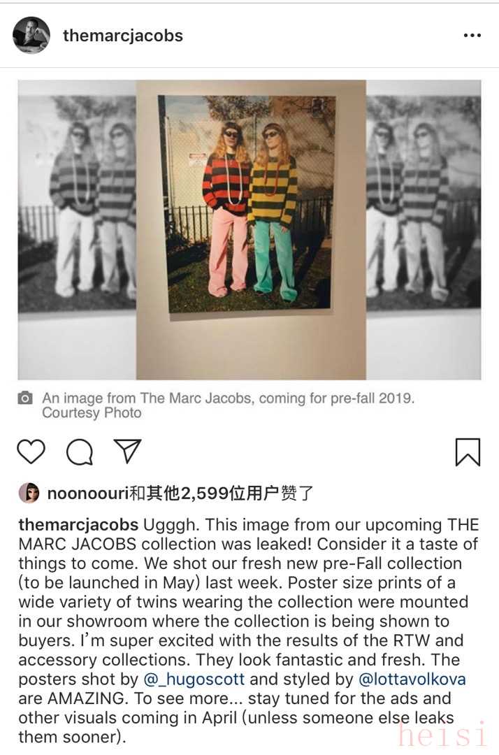 Marc Jacobs本人也在Instagram上證實(shí)了這個消息,看樣子這次消息泄露似乎不在他的預(yù)料之中。Jacobs說The的2019早秋系列上星期才拍攝完,沒過幾天的照片就被曝光了?!袄^續(xù)期待我們4月將推出的海報和廣告,除非也有人提前泄漏了。”Jacobs寫道。?
