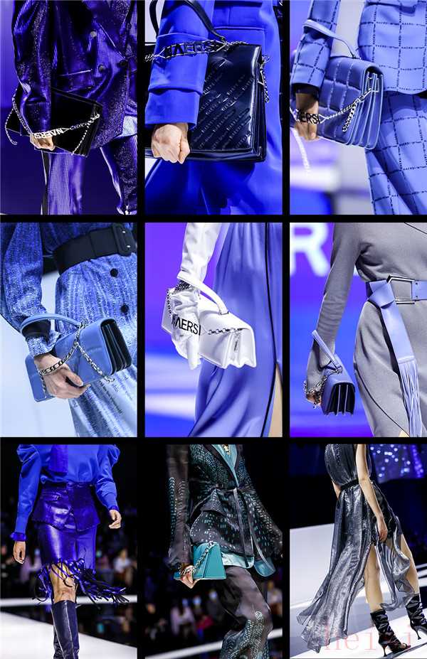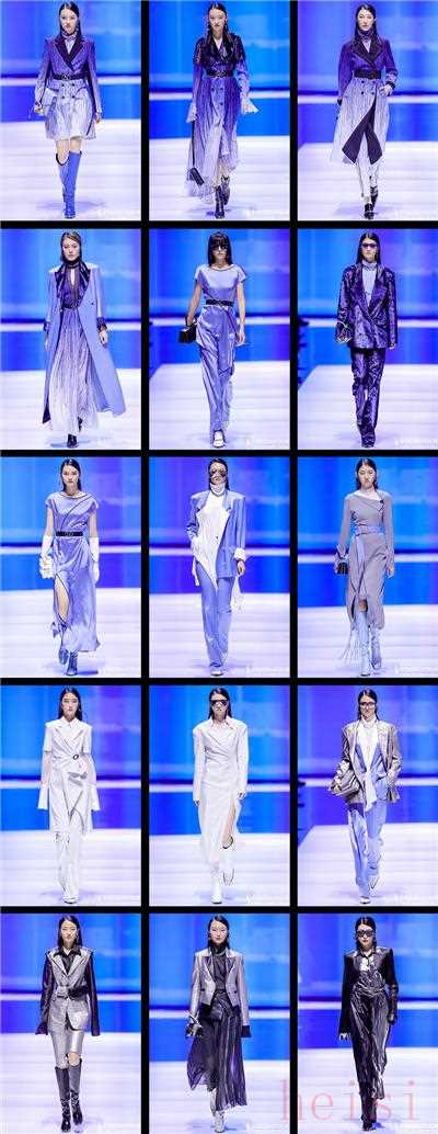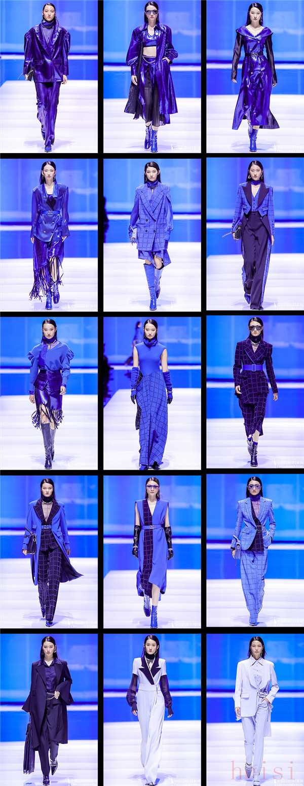 模特身著一套極具沖擊感的定制藍(lán)色廓形外套以篤定的姿態(tài)拉開了大秀序幕。該系列運(yùn)用提花及植絨等工藝再造材質(zhì),結(jié)合時(shí)下科技感十足的“藍(lán)片”科技面料,融入高定手法和真人立體剪裁,使得廓形外套、風(fēng)衣、闊腿褲簡(jiǎn)約又干練,細(xì)節(jié)中又透露出未來(lái)感,彰顯自信獨(dú)立的精英女性形象。