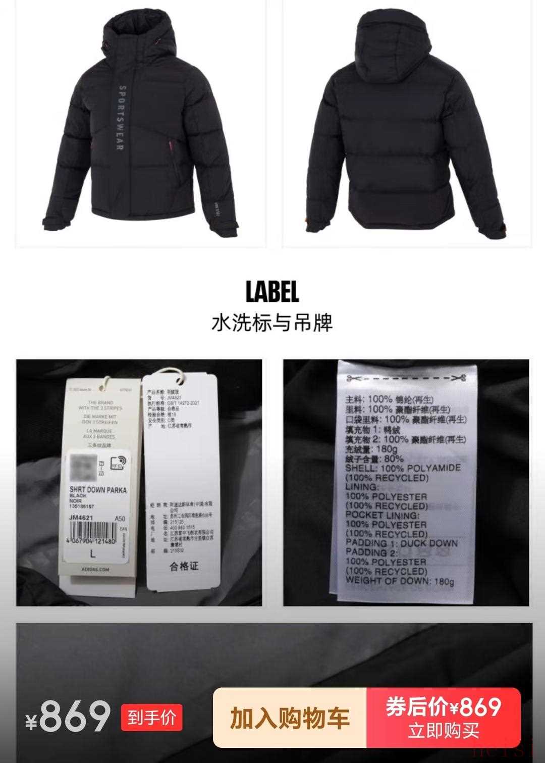 阿迪達(dá)斯京東自營(yíng)旗艦店由雪中飛代工的羽絨服商品信息
