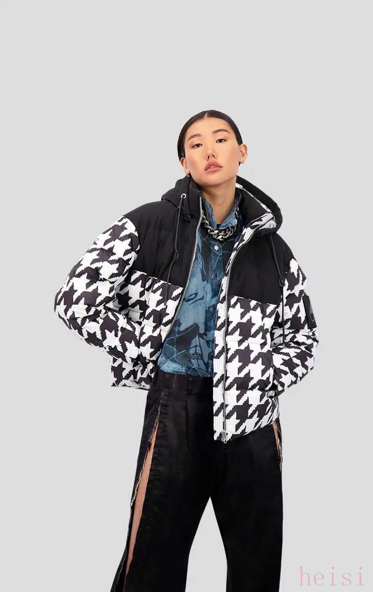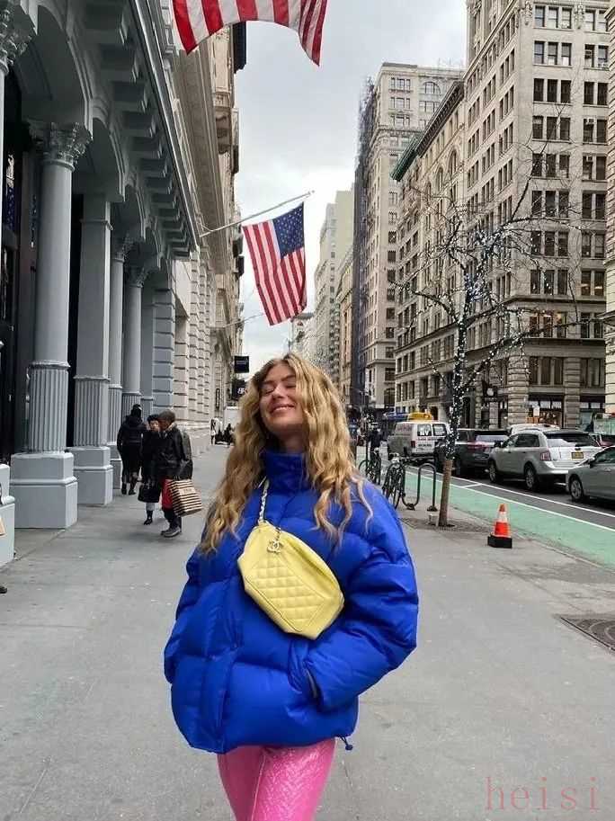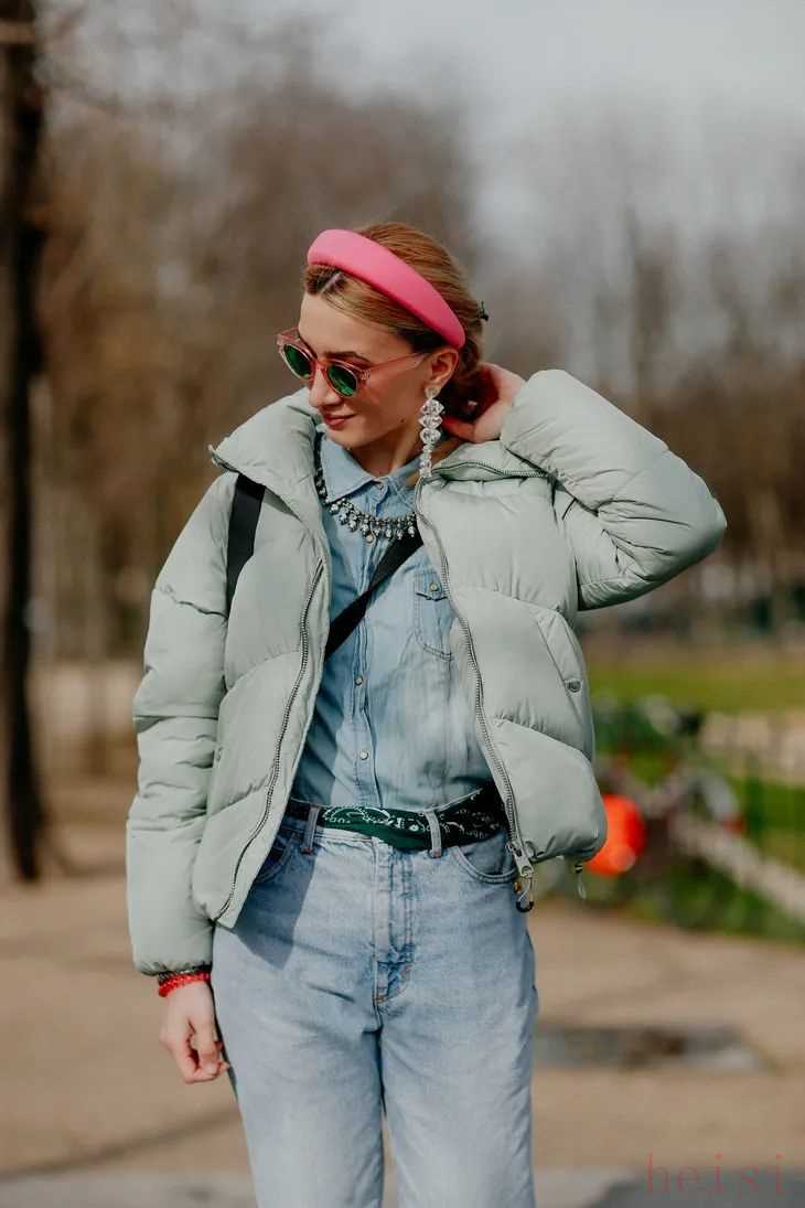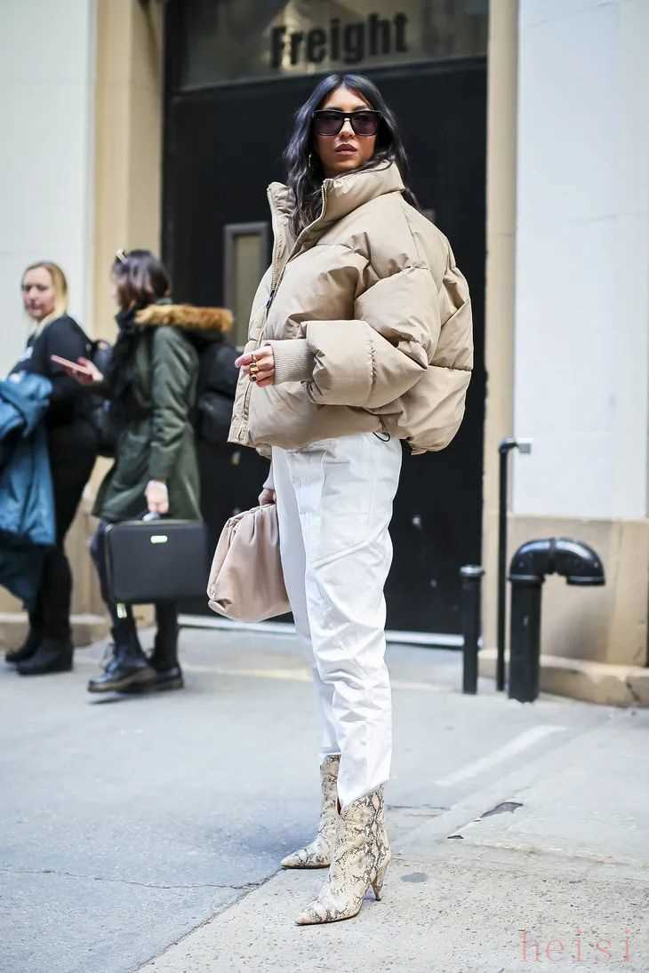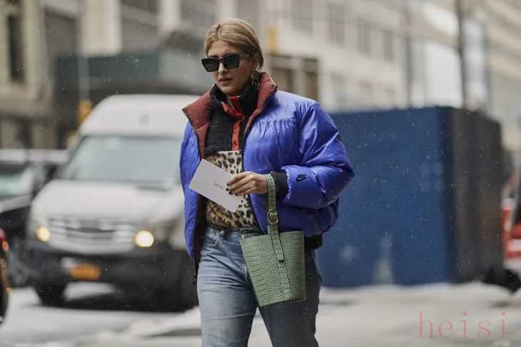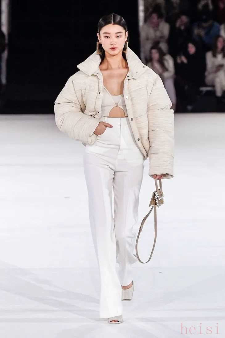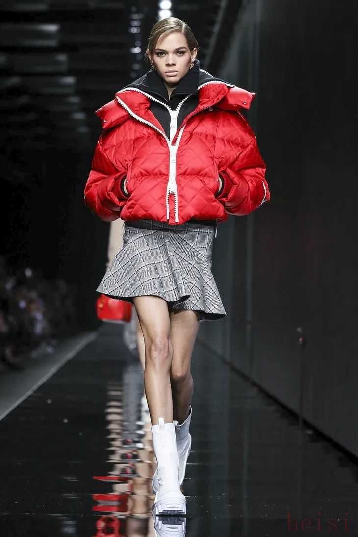 今年的新款也很跳躍吸睛:熒光色和黑色組合的雙面款、千格鳥裝飾以及高腰中長款……呈現(xiàn)出羽絨服的更多可能。