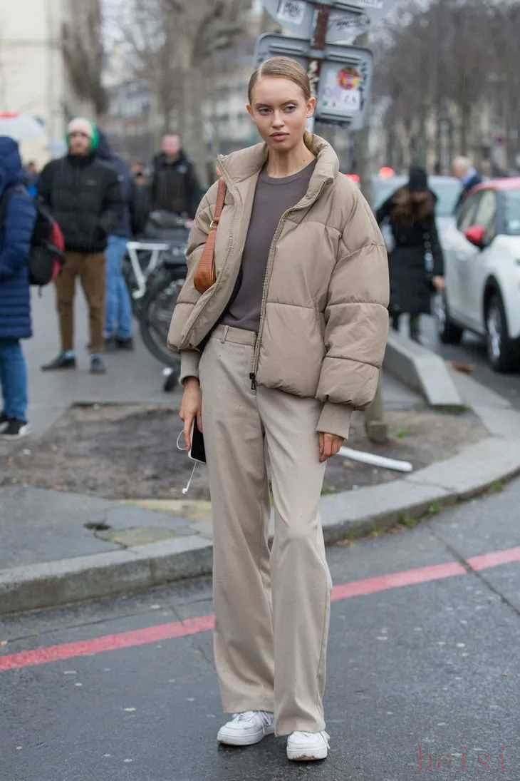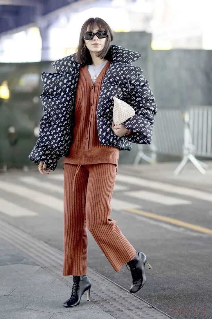通勤闊腿褲也能在面包服的包裹下保留本身的干練。