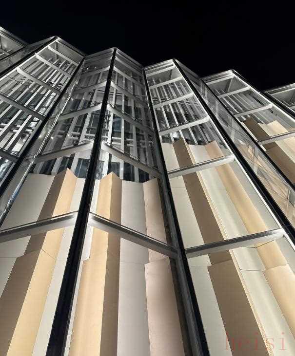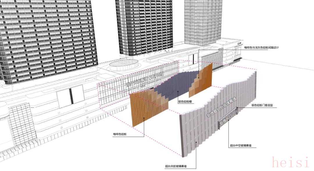 具體設(shè)計方案為:在原建筑玻璃幕墻外側(cè)新增咖啡色鋁板及銀色鋁格柵襯底,再增加一層三角玻璃幕墻裝飾。它不僅打破了原有單一陳舊的立面形象,也呈現(xiàn)了“模數(shù)化的立體空間序列”的藝術(shù)效果。