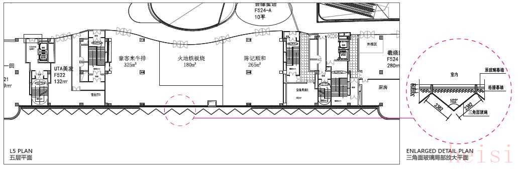三角面玻璃為了更好地體現(xiàn)三角斜面玻璃幕墻獨特性,方案將三角玻璃角度調(diào)整為102°的組合形式,隨著環(huán)境光線的變化,立面可在不同的時間段展現(xiàn)出微妙的質(zhì)感與色彩層次變化。