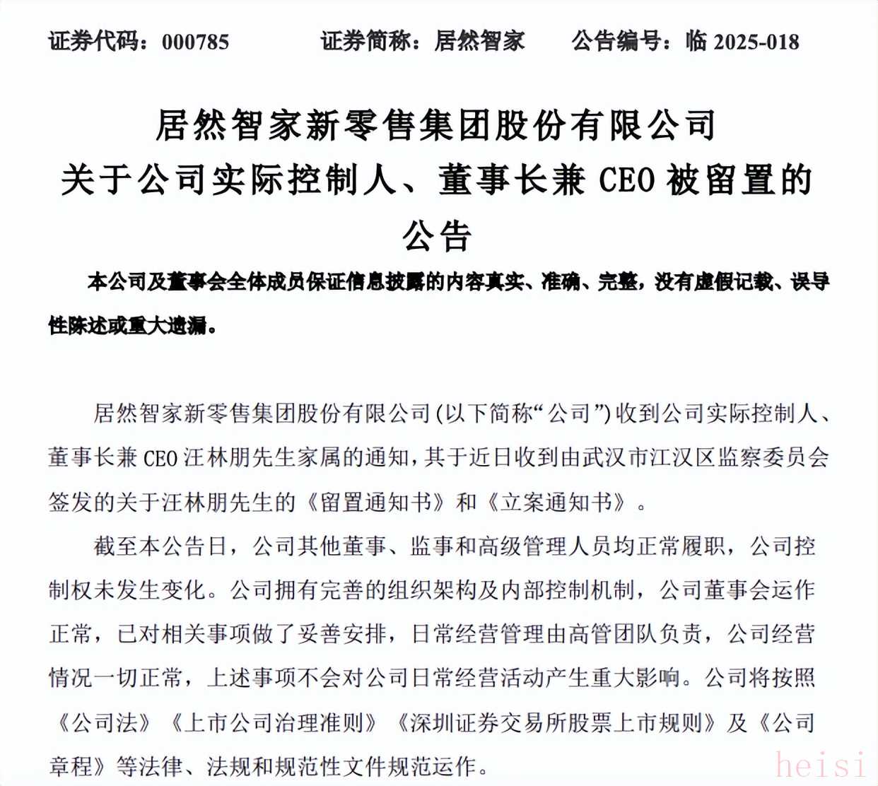 7月23日,居然智家新零售集團(tuán)再次發(fā)布公告,武漢市江漢區(qū)監(jiān)察委員會已解除對汪林朋先生的留置措施,變更為責(zé)令候查措施。汪林朋先生已回到工作崗位正常履職。未曾想,近期卻傳出汪林朋跳樓身亡的驚人消息。