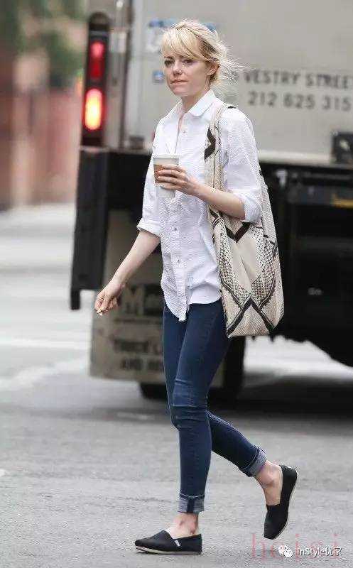 脫掉禮服的新晉奧斯卡影后艾瑪·斯通用帆布包來搭配同樣簡約清爽的造型,像一位鄰家大姐姐沒有距離。