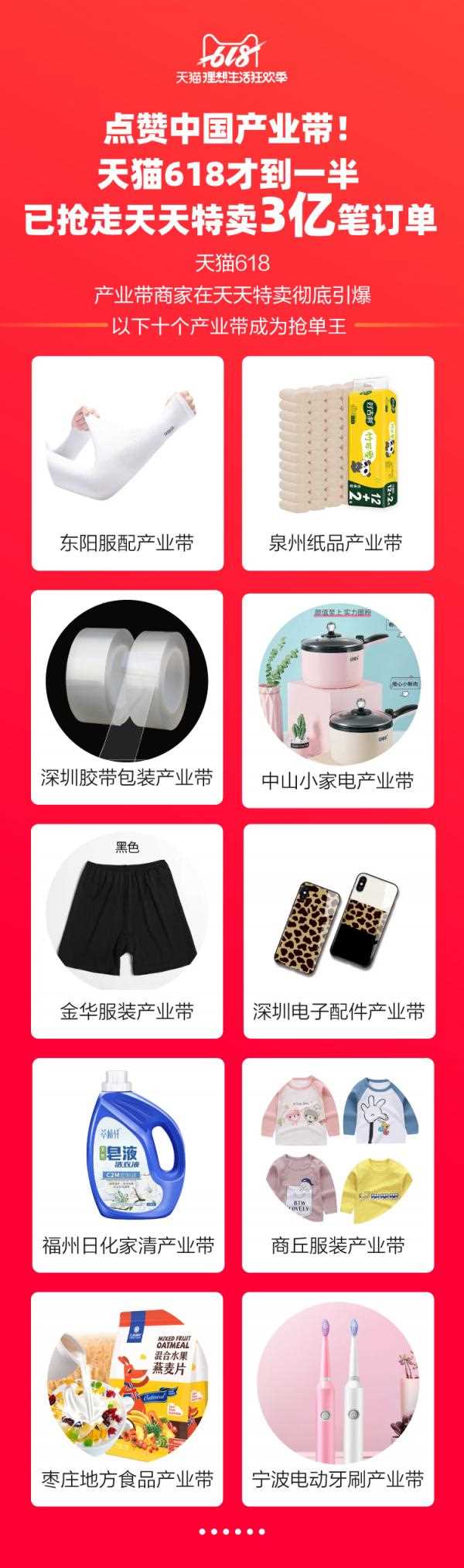 天貓618,中國產業(yè)帶商家率先達成“小目標”。6月10日,天天特賣宣布,今年“年中特賣會”上,中國產業(yè)帶商家已經成功搶得3億筆訂單,目標達成速度遠超預期。
