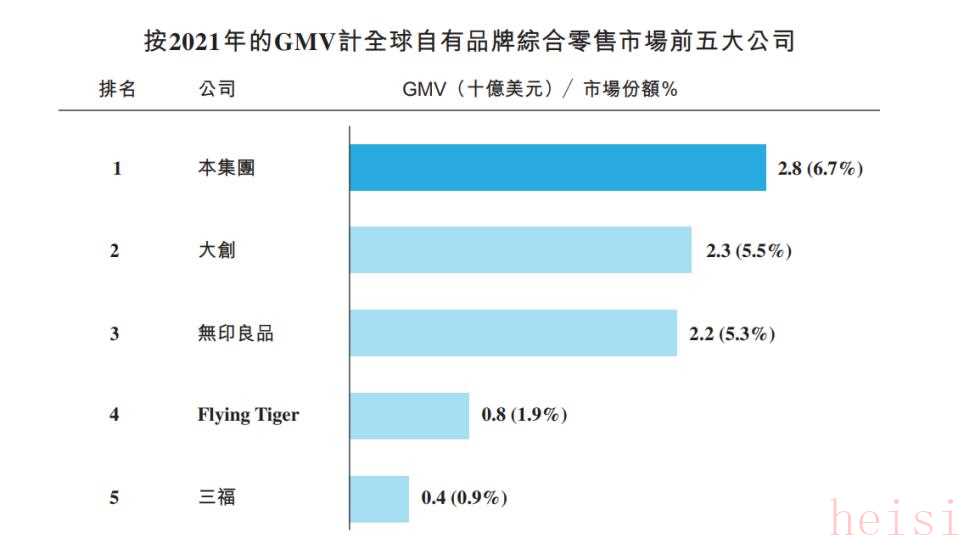 根據(jù)弗若斯特沙利文報告,名創(chuàng)優(yōu)品是“全球最大的自有品牌生活家居綜合零售商”。2021年,名創(chuàng)優(yōu)品GMV(商品交易總額)總計約為28億美元,占全球此類市場份額為6.7%。