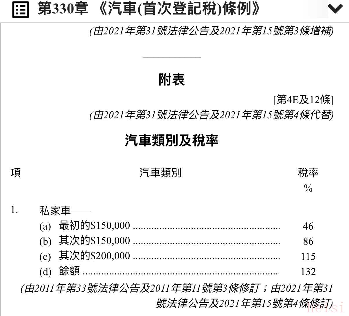 一般電動私家車車主的首次登記稅寬減額上限由97,500港元下調至58,500港元;符合“一換一”計劃條件的車主,寬減額上限由287,500港元調整至172,500港元; 應課稅價值(即稅前車價)超過50萬港元的電動私家車,將不再享有任何首次登記稅寬減。