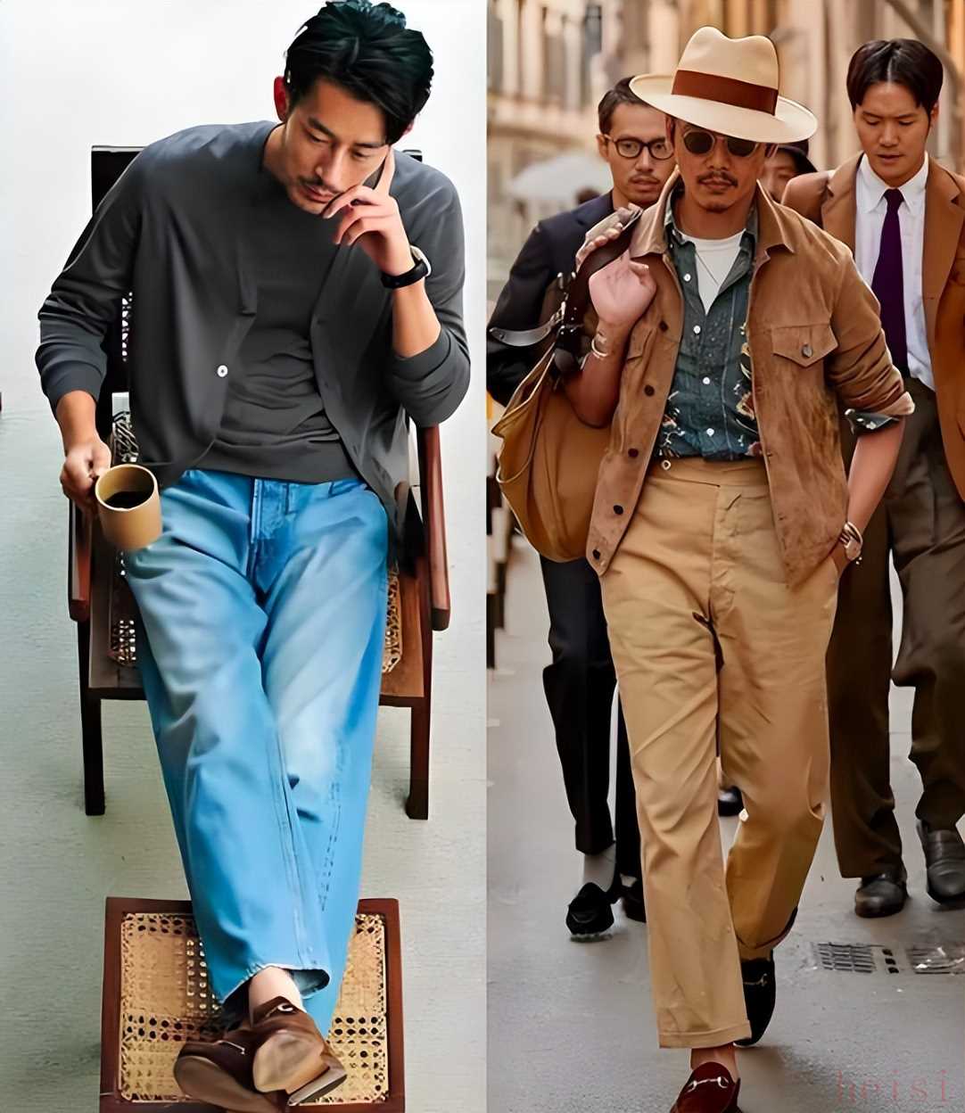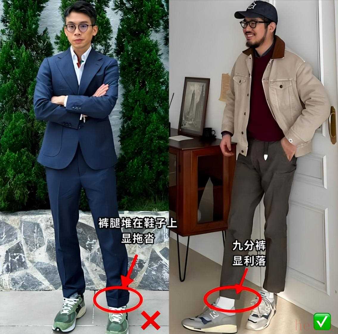 這是最最核心的一條!褲腳千萬不能堆在鞋面上,那是精神小伙和老大爺?shù)拇┓?。無論是穿直筒褲還是休閑褲,褲長(zhǎng)最好在腳踝以上,或者剛好到鞋面。