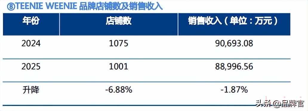 Teenie Weenie門店數(shù)量從2019年的1272家,減少到了2025年上半年的1001家,減少21%。