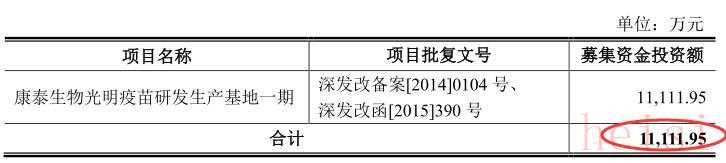 隨后在康泰生物2017年1月19日公布的最新版招股書中,實(shí)際募集資金變更為1.11億元,募資僅投向康泰生物光明疫苗研發(fā)生產(chǎn)基地一期。