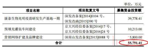康泰生物于2015年6月19日在證監(jiān)會(huì)網(wǎng)站發(fā)布招股說(shuō)明書,2016年12月5日發(fā)布預(yù)披露更新,保薦機(jī)構(gòu)為中信建投。根據(jù)后一版招股說(shuō)明書,康泰生物募集資金為5.58億元,分別用于投資康泰生物光明疫苗研發(fā)生產(chǎn)基地一期、預(yù)填充灌裝車間建設(shè)、營(yíng)銷網(wǎng)絡(luò)擴(kuò)建及品牌建設(shè)等。