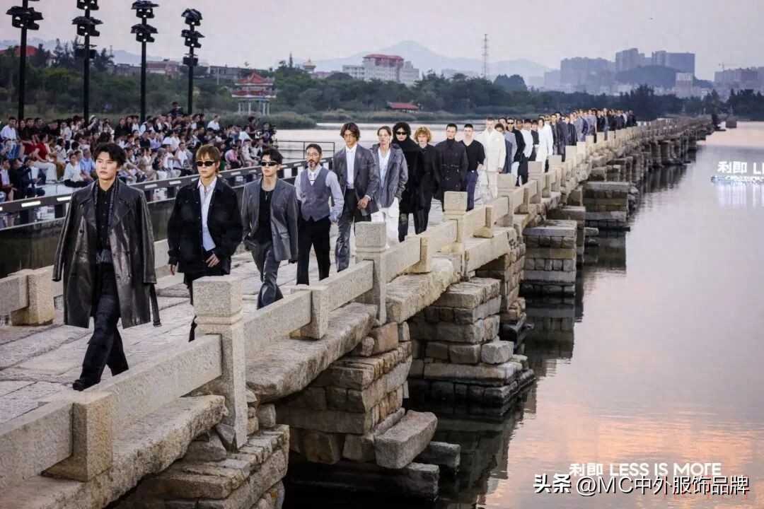 2023年安平橋大秀中,他用宋代黑白灰配色呼應(yīng)利郎LESS IS MORE “青年商務(wù),本該輕松”的理念,將古橋建筑感融入剪裁。安平橋大秀作為利郎集團(tuán)的第一次戶外大秀,大膽采用說(shuō)唱圈的半壁江山,歐陽(yáng)靖等共7位Rapper壓軸走秀,成功打破商務(wù)男裝刻板印象。