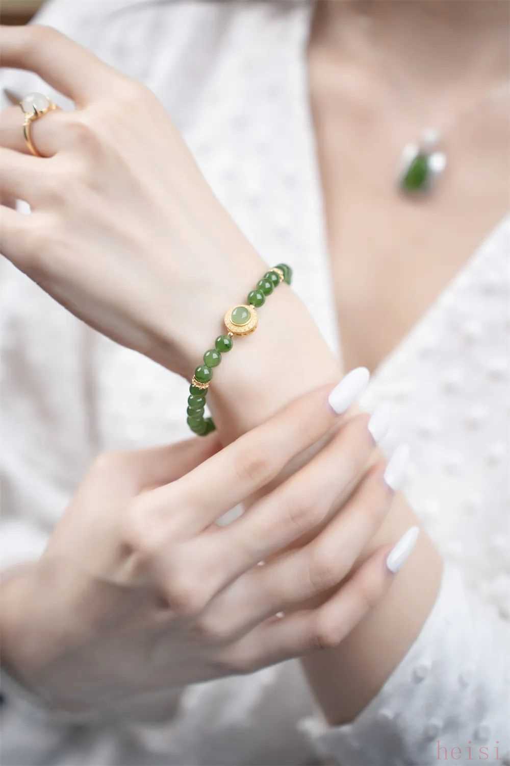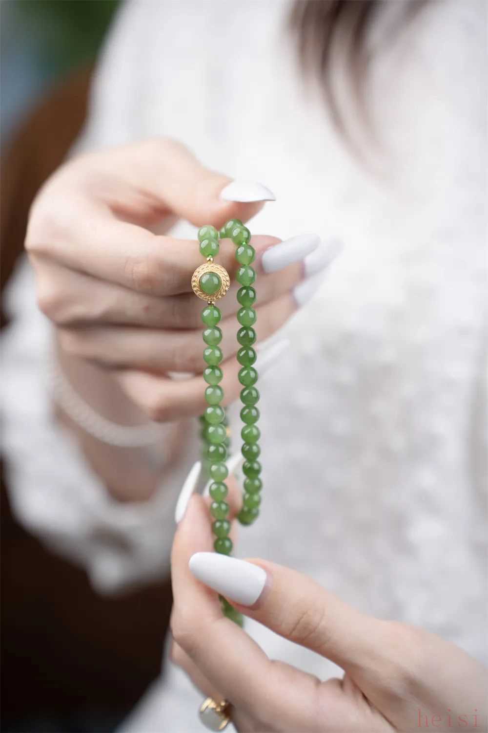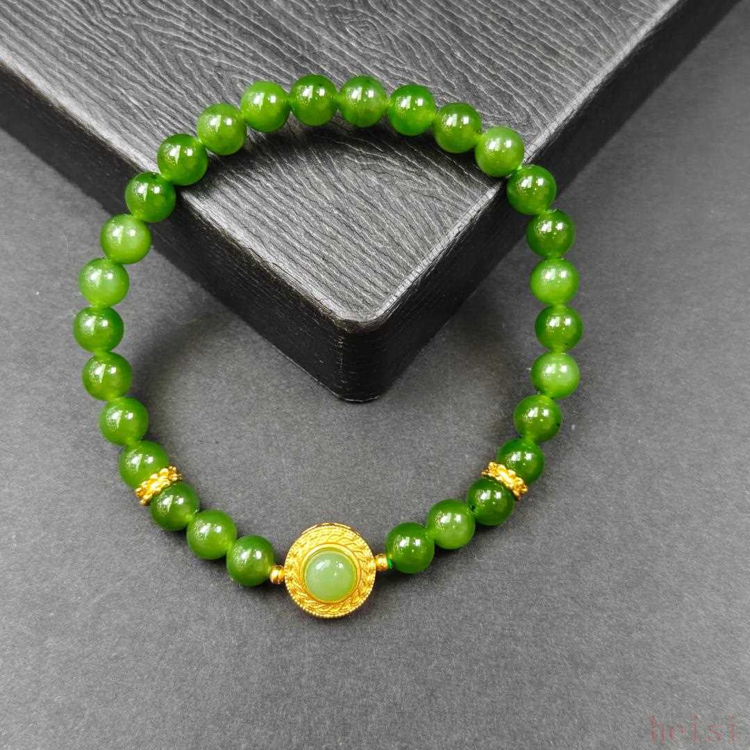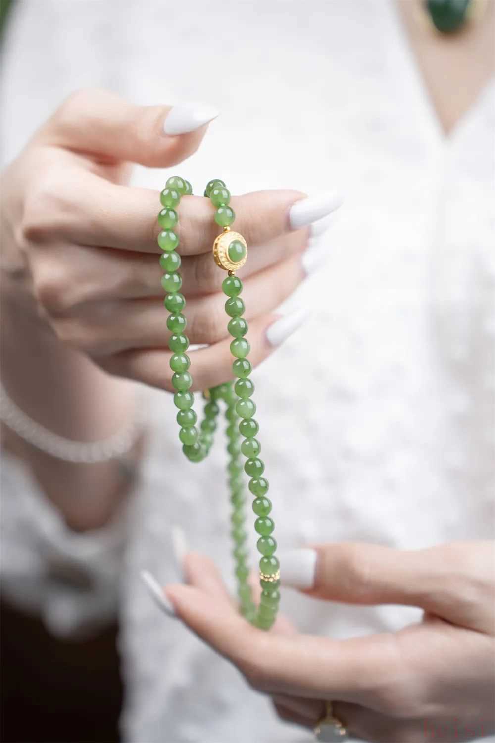 手串精選碧玉珠,顆顆溫潤如凝脂,像是把夏日的森林綠色揉進了玉里,腕間是無盡的翠色詩意。