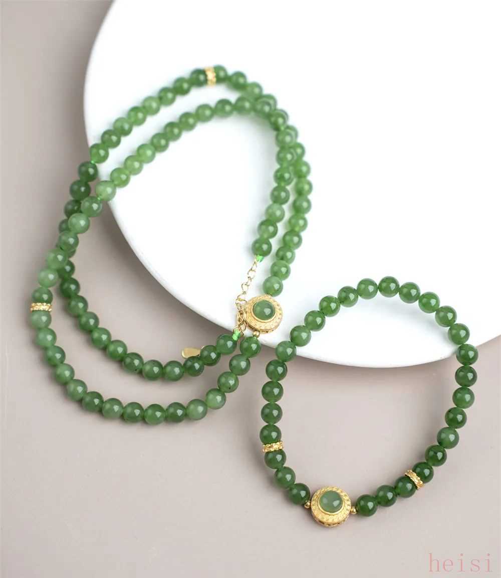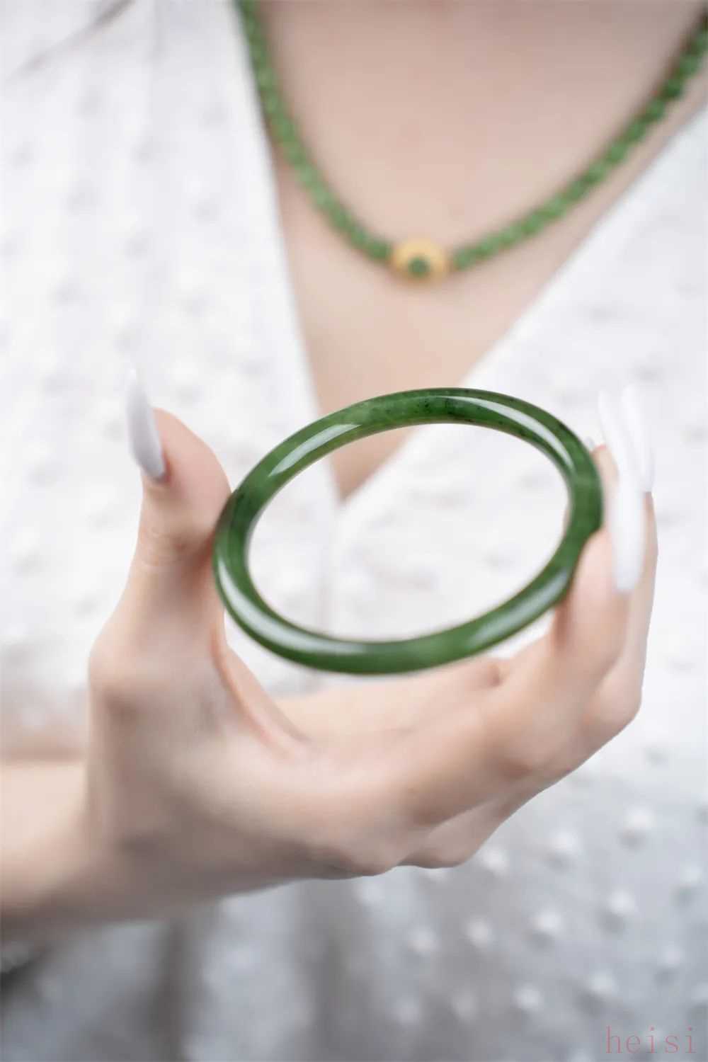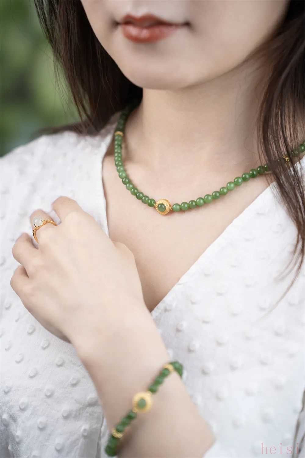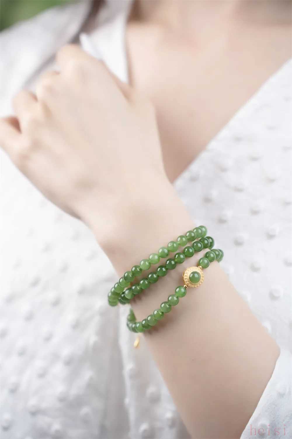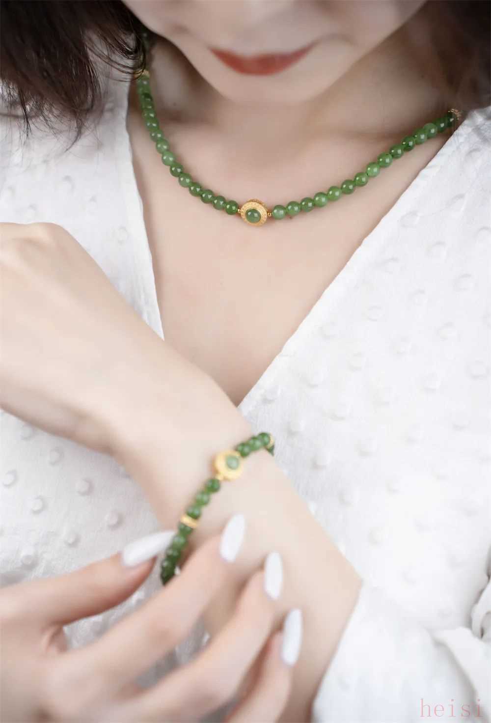 手串精選碧玉珠,顆顆溫潤如凝脂,像是把夏日的森林綠色揉進了玉里,腕間是無盡的翠色詩意。