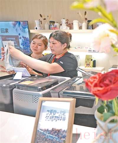 遼寧大連天津街京東MALL商場(chǎng)的咖啡體驗(yàn)官(右)陪顧客體驗(yàn)咖啡制作。