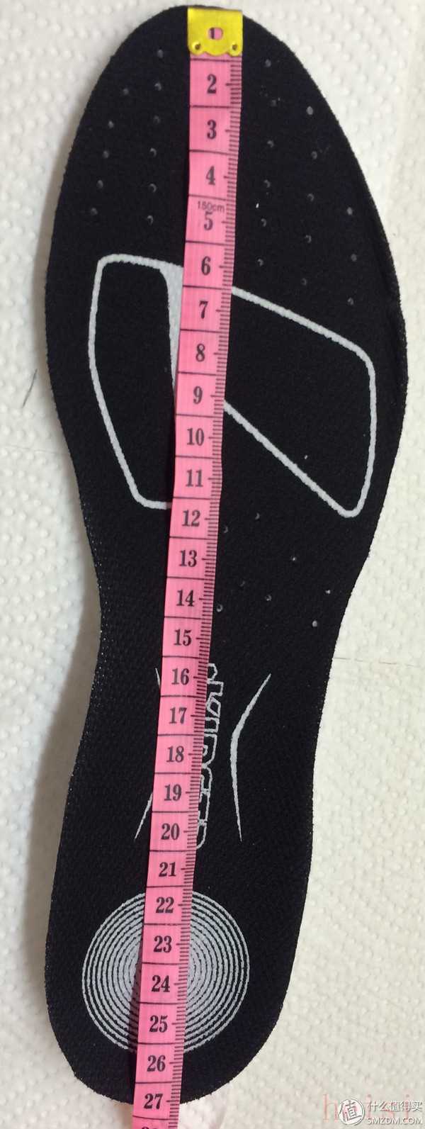 這給尺碼測量帶來了一定問題。不過好在前兩天買了雙迪卡儂的鞋墊,放進(jìn)去基本正好,就用迪卡儂的鞋墊尺寸表示該鞋的內(nèi)長吧: