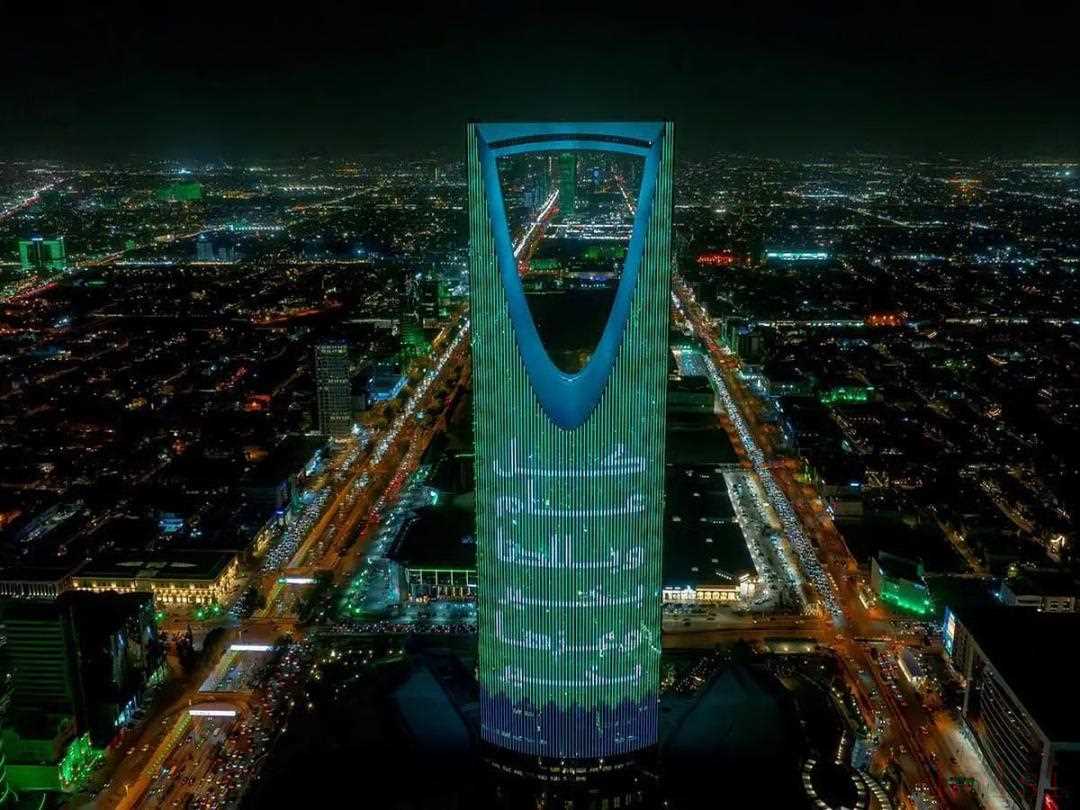 國慶節(jié)當(dāng)天,在利雅得,天際線被綠色和白色照亮,標(biāo)志性建筑和紀(jì)念碑展示了沙特國旗的顏色。