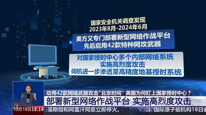 消息來源:央視新聞10月19日報道《動用42款網(wǎng)絡武器攻擊“北京時間”,美國為何盯上國家授時中心?》