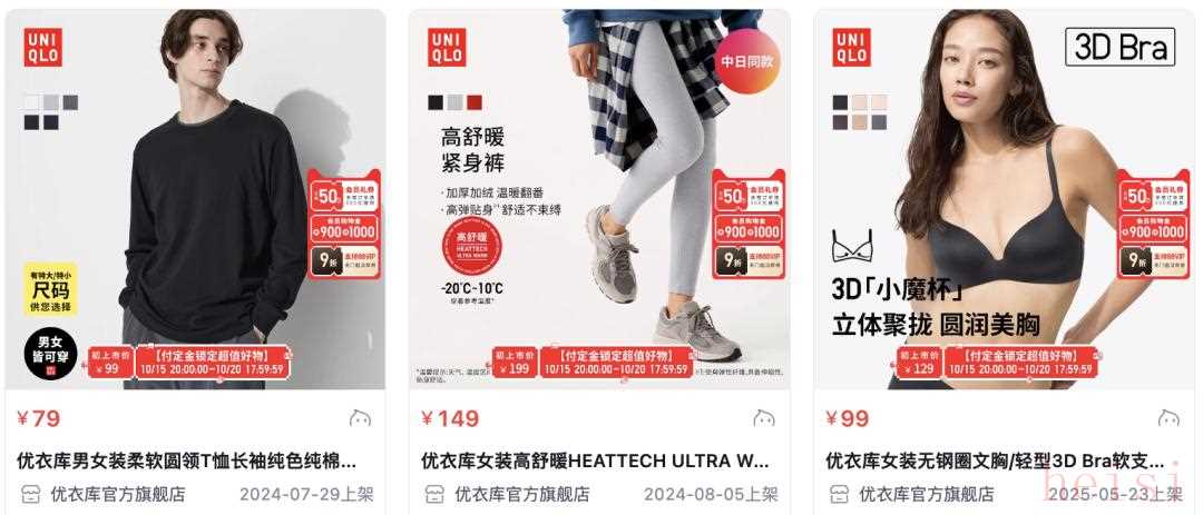 3.「優(yōu)衣庫官方旗艦店」的預(yù)定收藏數(shù)TOP 3分別為長袖T恤、打底緊身褲與內(nèi)衣品類,定價主要集中在79-149元區(qū)間內(nèi)。