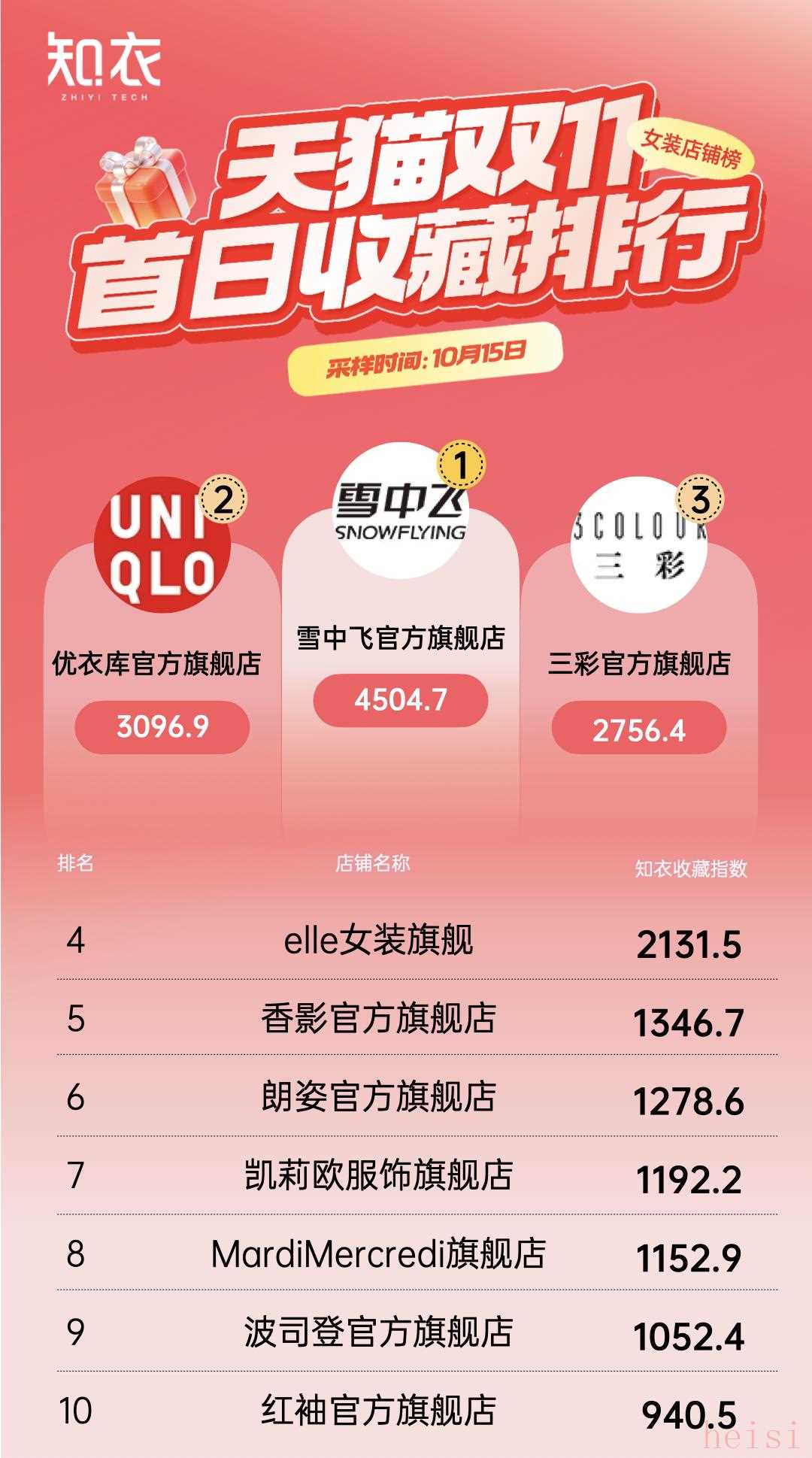1.女裝店鋪15日收藏量排名前3店鋪分別為「雪中飛官方旗艦店」、「優(yōu)衣庫官方旗艦店」與「三彩官方旗艦店」。