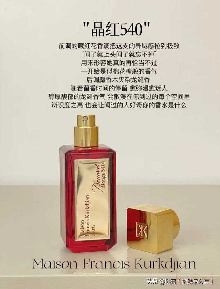 第五款:MFK晶紅540最近在香圈里火得不行不行的MFK晶紅540,大家應(yīng)該都聽說(shuō)過(guò)吧?這香水簡(jiǎn)直是火爆到不行!它有兩種版本:白瓶是EDP版本,紅瓶是Extrait版本。兩個(gè)版本的辨識(shí)度都特別高,一眼就能認(rèn)出來(lái)。