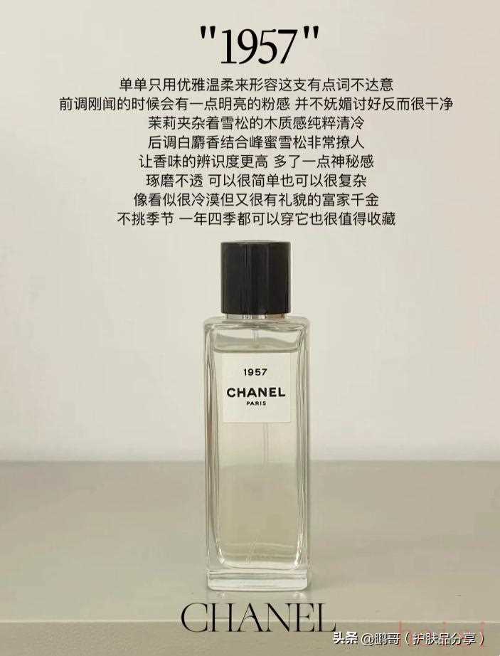 第三款:香奈兒1957自由又溫柔,混合了八種白麝香的香氣,猶如無(wú)數(shù)透明面紗層層堆疊,細(xì)膩的融合了佛手柑、鳶尾花和苦橙花,在雪松、香草和蜂蜜味道的交互下氣味非常有層次感。甜蜜又夾雜著麝香的深沉,仿佛從少女蛻變成女人的過(guò)程,精致、個(gè)性。